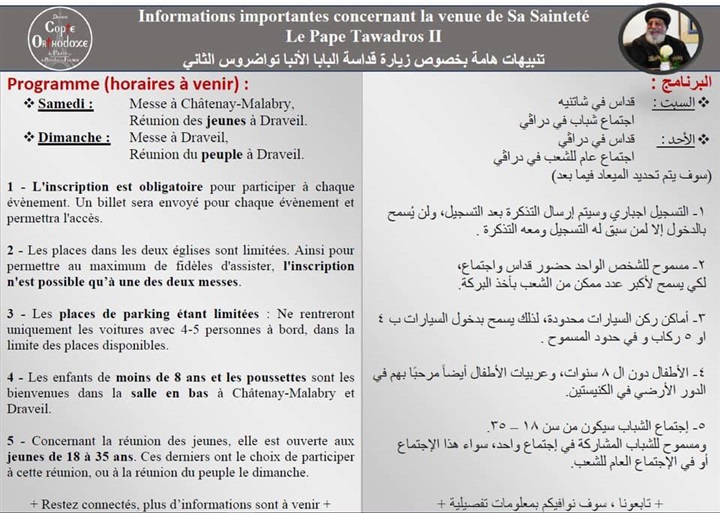 وأكدت الإيبارشية أنه لن يُسمح للفرد الواحد بالحضور في أكثر من قداس وأكثر من اجتماع، لإتاحة الإمكانية لأكبر عدد من الشعب القبطي في فرنسا بالمشاركة.