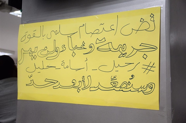 وعلق الزملاء لافتات كُتب عليها: "معتصمون حتى عودة الحقوق، الاعتصام مستمر حتى رحيل أسامة خليل، غير المعينين وضعهم إيه، المساومة على الحقوق مرفوضة".