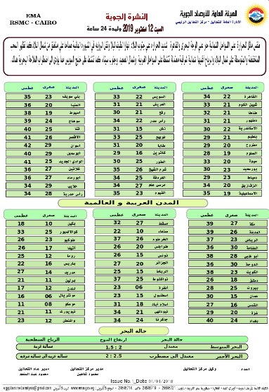 بيان الهيئة العامة للأرصاد الجوية بحالة الطقس اليوم السبت 12 أكتوبر 2019 ودرجات الحرارة في مصر والمدن والعواصم العربية والأجنبية
