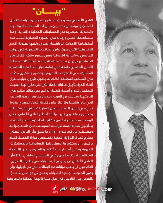 الأسباب الحقيقية خلال بيان الأهلي الرسمي ردًا على تأجيل مباراة القمة.