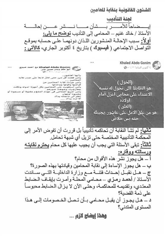 أعلنت إدارة الشئون القانونية بنقابة المحامين، أن سبب إحالة المحامي خالد غنيم للتأديب هو المنشورين اللذين دونهما على حسابه بموقع التواصل الاجتماعي (فيسبوك) بتاريخ 4 أكتوبر الجاري، مرفقة لهما صورتين بالبيان الصادر اليوم الأربعاء.