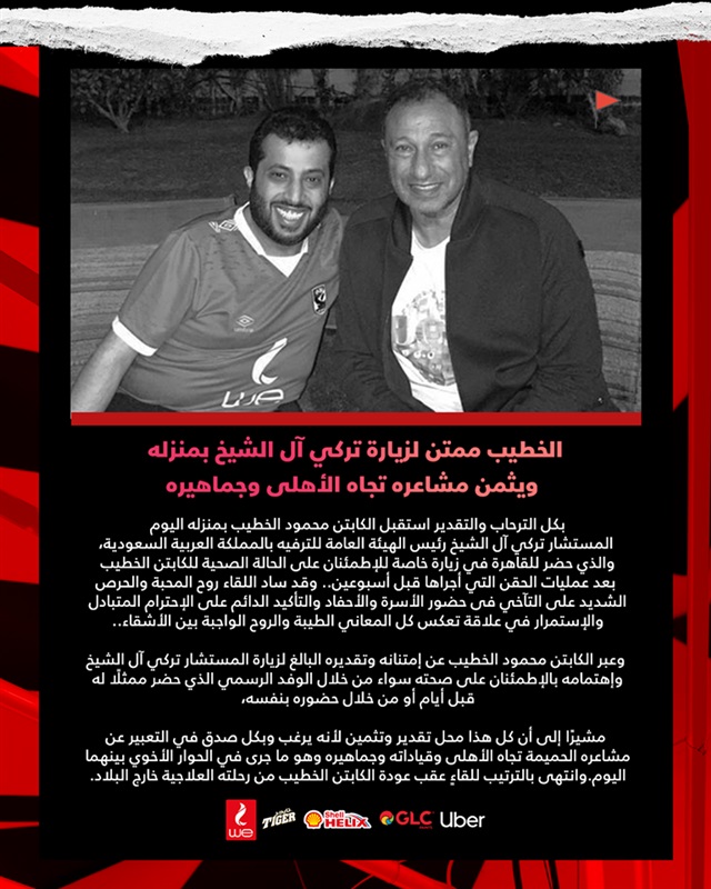 وكان تركي آل الشيخ قد أرسل منذ أيام مندوبه عبد الرحمن الحمود لمنزل الخطيب للاطمئنان على سلامته وسط ترحاب كبير من رئيس النادي الأهلي.