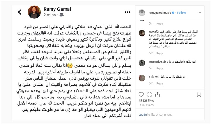 نص منشور رامي جمال عن تفكيرة في اعتزال الغناء