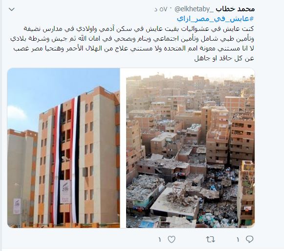 قال محمد خطاب، إن الأوضاع في مصر تغيرت عن ذي قبل، إذ أنه كان يقطن في العشوائيات أما الآن فأصبح يسكن في مساكن أدمية متطورة، كما أنه أصبح مطمئن على مستقبل أولاده بعد أن أصبحوا يدرسون في مدارس تعطيهم فرصة لحياة أمنه، كما أنهم ستشملهم منظومة التأمين الطبي الشامل والتأمين الاجتماعي.