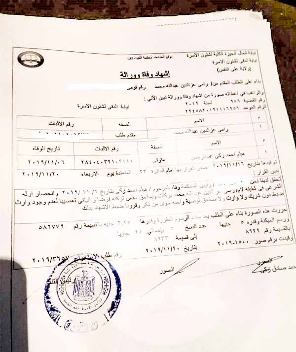 أعلنت محكمة الأسرة بالجيزة عن الوريت الوحيد للفنان الراحل هيثم احمد زكي الذي توفي يوم 6/11/2019، بعد طلب أخيه من الأم "رامي عبد العزيز" أعلان وراثة وشهادة وفاة.
