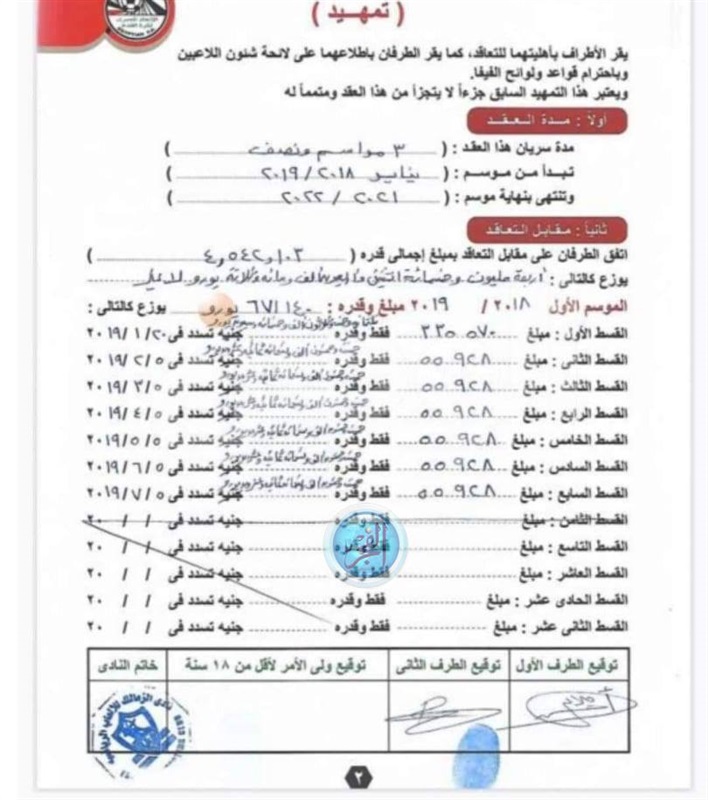 وينفرد "الفجر الرياضي" بصور عقد المغربي خالد بو طيب والتي وصلت قيمته إلى ٤,٥٤٢,١٠٣ يورو في ثلاثة مواسم ونصف، بالإضافة إلى صرف مبلغ ٦٤٥٣ جنيه بدل لعدم وجود سيارة.