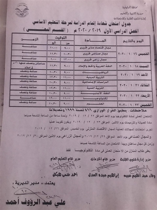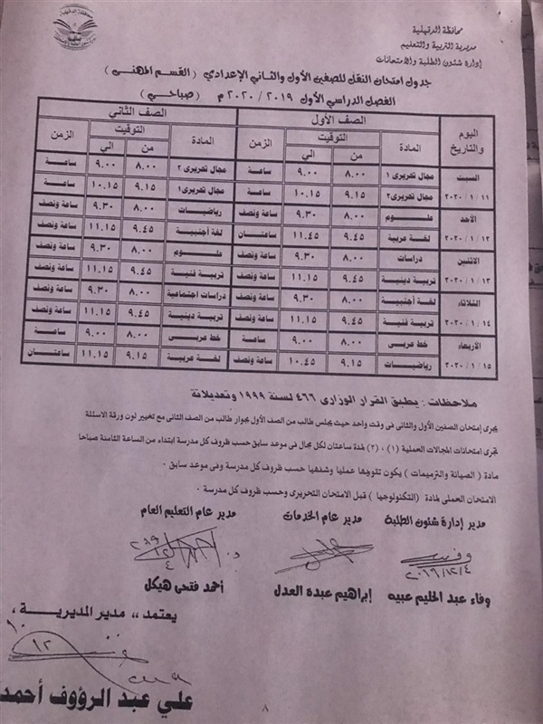 جداول امتحانات الفصل الدراسي الأول لمراحل التعليم المختلفة بالدقهلية