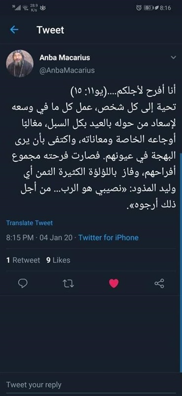 وقال مكاريوس في رسالته عبر حسابه الشخصي علي مواقع التواصل الإجتماعي " تويتر": "تحية لكل شخص عمل كل ما في وسعه لإسعاد من حوله بالعيد بكل السبل، مغالبا أوجاعه الخاصة ومعاناته واكتفى بأن يرى في عيونهم الفرح والسعادة"