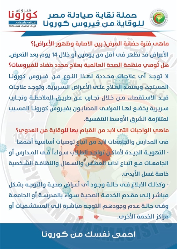 أعلنت الدكتورة فاتن عبدالعزيز عضو لجنة إدارة النقابة العامة للصيادلة، إطلاق حملة توعية للوقاية من فيروس كورونا، موضحة أن النقابة أعدت كتيبًا سيتم توزيع 10 آلاف نسخة منه على الصيدليات من خلال النقابات الفرعية بالمحافظات.