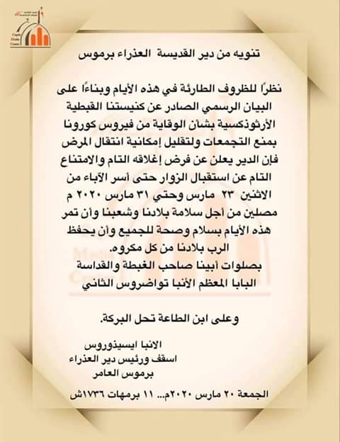 وقال رئيس الدير، إن القرار جاء لهدف منع التجمعات وتقليل إمكانيات انتشار وباء فيروس كورونا، مضيفًا: "مُصلين من أجل سلامة بلادنا، وشعبنا، وأن تمر بسلام وصحة للجميع؛ وأن يحفظ الرب بلادنا من كل مكروه".