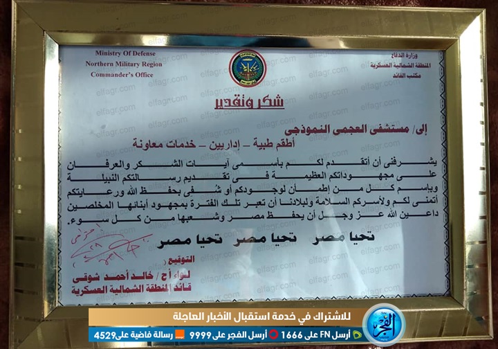 وإرسل قائد المنطقة الشمالية رسالة شكر وتقدير وعرفان إلى مستشفى العجمى النموذجي (أطقم طبية - إداريين- خدمات معاونة) المجهود المبذول.