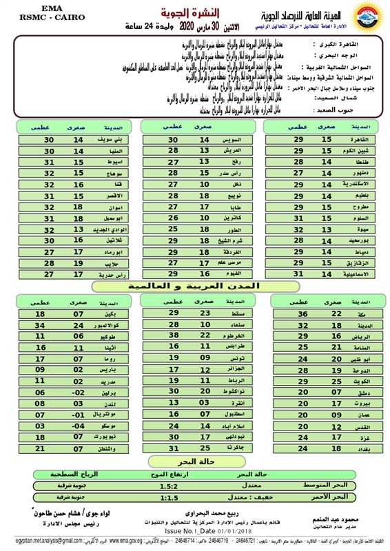 نشرت الهيئة العامة للأرصاد الجوية المصرية، بيانًا يكشف عن حالة الطقس المتوقعة اليوم الاثنين الموافق 30 مارس 2020، على مدن ومحافظات الجمهورية، موضحة أنه طقس بارد ليلًا على معظم الأنحاء، محذرة من نشاط الرياح المثيرة للرمال والأتربة.