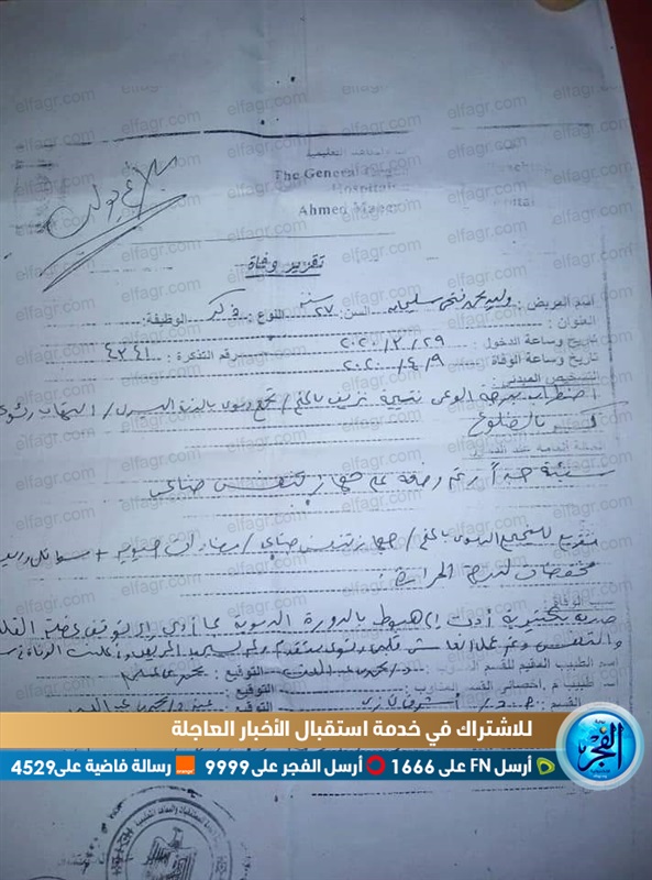 وأوضح المصدر إلى "الفجر" أن قسم الموسكى تلقى بلاغا من والد المحتجز يفيد باحتجاز نجله داخل القسم حتى أصيب بنزيف فى المخ وكسر فى 3 ضلوع وتحرر المحضر رقم 456 ادارى قسم شرطة الموسكى وفقا للتقارير الطبية لسبب الوفاة.