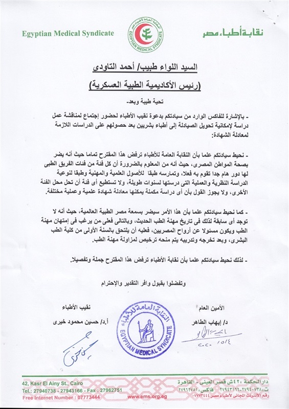 كما نحيط سيادتكم علما بان هذا الأمر سيضر بسمعة مصر الطبية العالمية، حيث أنه لا توجد أي سابقة لذلك في تاريخ مهنة الطب الحديث، وبالتالى فعلى من يرغب في إمتهان مهنة الطب ويكون مسئولا عن أرواح المصريين، فعليه أن يلتحق بالسنة الأولى من كلية الطب البشري، وبعد تخرجه وتدريبه يتم منحه ترخیص لمزاولة مهنة الطب.
