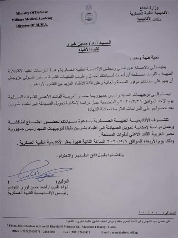 وطالب بوقف الخطاب الذي أرسله اللواء طبيب أحمد التاودي، رئيس الأكاديمية الطبية العسكرية، للدكتور حسين خيري نقيب الأطباء، يدعوه فيه لحضور اجتماع لمناقشة عمل دراسة لإمكانية تحويل الصيادلة إلى أطباء بشريين بعد حصولهم على الدراسات اللازمة المعادلة للشهادة.
