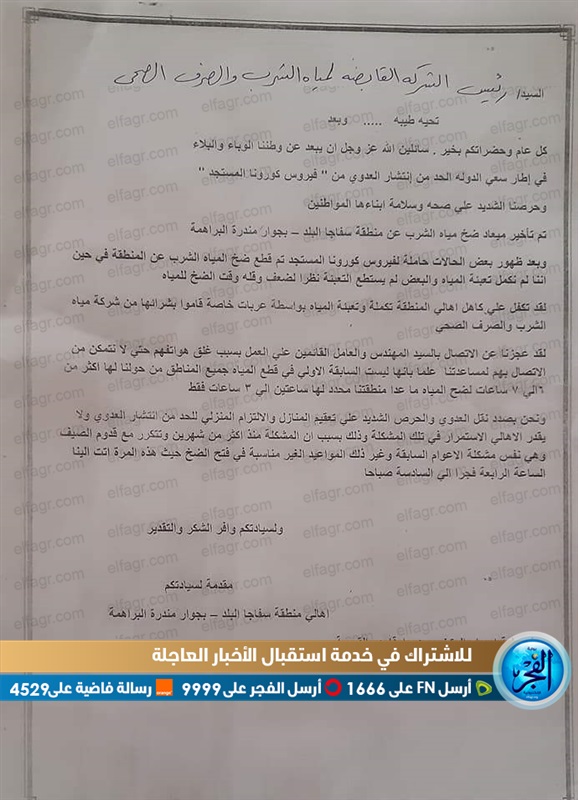 أهالي منطقة سفاجا البلد تناشد المحافظ بسبب مياه الشرب (مستند)