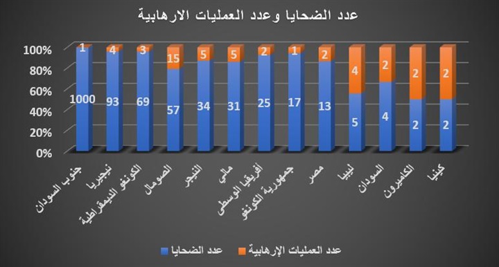 وأورد التقرير أن أكثر الأقاليم تضررًا هو إقليم شرق أفريقيا بواقع 1059 ضحية، أي حوالي 76.02% من النسبة الكلية لضحايا الشهر، وذلك نتيجة 18 عملية إرهابية معلن عنها في 3 دول. فيما جاءت جمهورية جنوب السودان في طليعة الدول التي تأثرت بالإرهاب هذا الشهر، وسقط فيها ما يبلغ 1000 شخصًا، وتعرضت دولة الصومال للعدد الأكبر من العمليات الإرهابية بعد النشاط الملحوظ لحركة الشباب بواقع 15 عملية إرهابية.