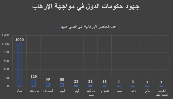 بينما جاءت دولة نيجيريا في طليعة الدول التي استطاعت اسقاط أكبر عدد من العناصر الإرهابية لما وصل لـ143 عنصرًا إرهابيًا.