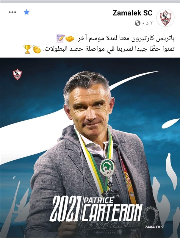 ونشرت الصفحات الرسمية لنادي الزمالك عبر مواقع التواصل الاجتماعي المختلفة صورة للمدرب الفرنسي وكتبت : باتريس كارتيرون معنا لمدة موسم آخر".