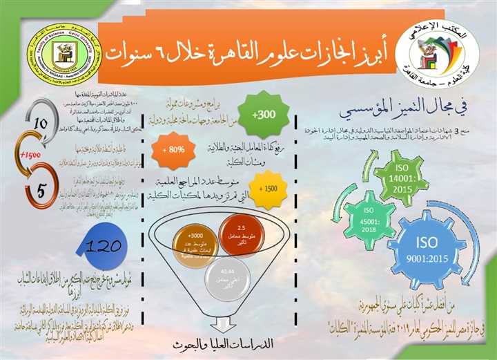 استعرض الدكتور عبد الحميد وجدي المناوي عميد كلية العلوم جامعة القاهرة، تقريرا مقدما من المكتب الإعلامي للكلية، حول أبرز أنشطة وانجازات الكلية خلال ٦ سنوات على المستوى التعليمي والبحثي والمجتمعي والتميز المؤسسي، والذي أظهر تطورا ملحوظا في كافة أنشطة الكلية بجميع قطاعتها المختلفة، مؤكدا أن إيمان القيادة السياسية بالعلم والعلماء يشكل دفعة قوية للاستمرار في تنفيذ استراتيجية الدولة المصرية، ومشيرا إلي الدعم الغير مسبوق من جامعة القاهرة، برئاسة الدكتور محمد عثمان الخشت، لتنفيذ جميع أنشطة وفعاليات الكلية والمنبثقة من استراتيجية الجامعة للتحول إلى جامعة من الجيل الثالث وكذلك تعزيز دور الكلية في تحقيق أهداف التنمية المستدامة.