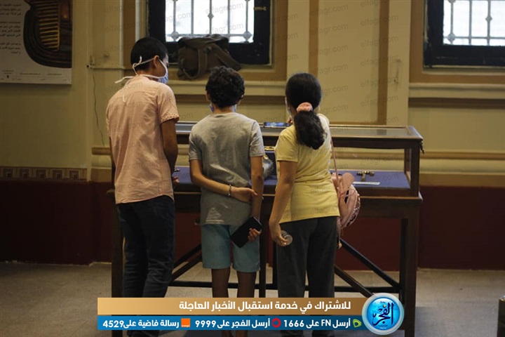 ثلاثة من الأطفال تابعتهم كاميرا الفجر، وهم يتجولون بين مقتنيات الملك الصغير، واستوقفهم القناع الذهبي، الذي يعد أغلى وأندر تحفة أثرية في العالم، والتقطوا له العديد من الصور.