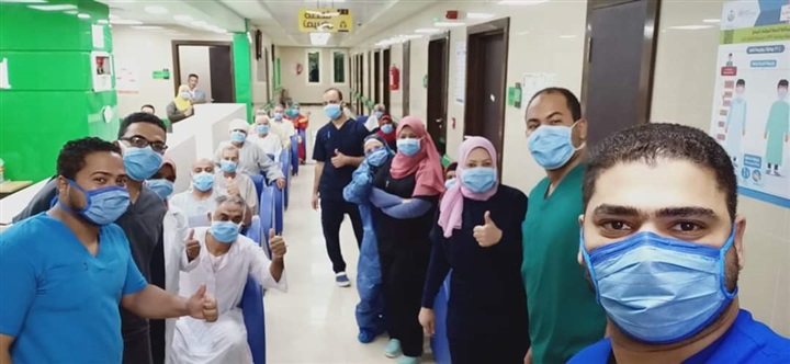 ونشرت وزارة الصحة على صفحتها الرسمية بموقع التواصل الاجتماعي فيسبوك، صور لـ16 حالة داخل فناء المستشفى بعد إتمام شفائهم.