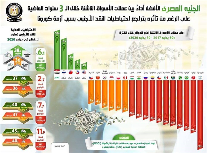 وأوضح المجلس خلال إنفوجراف له، أن الجنيه المصري ارتفع بنسبة 10.8% أمام الدولار متصدرًا قائمة أفضل عملات الأسواق الناشئة خلال الفترة من 30 يونيو 2017 وحتى يونيو 2020، جاء بعده عملات دول تايلاند وتايوان، والفلبين، وماليزيا على الترتيب.