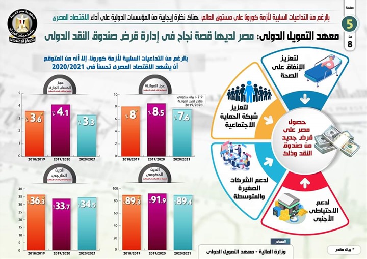 وأوضح الإنفوجرافيك، توقع "معهد التمويل الدولي" بأن يشهد الاقتصاد المصري تحسنًا في عام 20202021، بالرغم من التداعيات السلبية لأزمة كورونا، متوقعًا أن يبلغ عجز الموازنة 8.5% كنسبة من الناتج المحلي الإجمالي عام 20192020، في حين تراجع عجز الموازنة إلى 7.9% وفقًا لبيان حكومي مقدر عام 20192020.