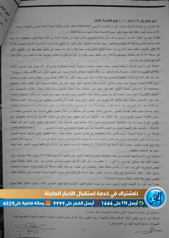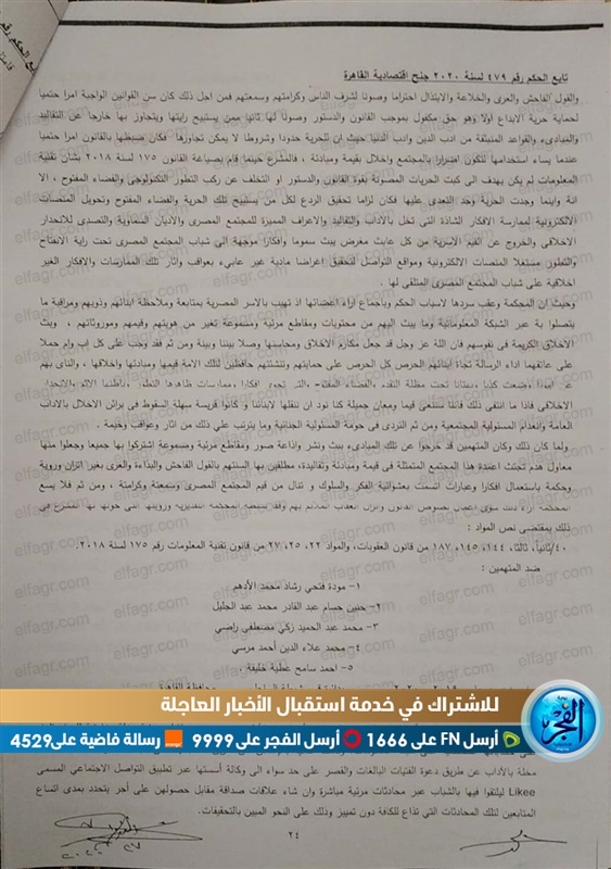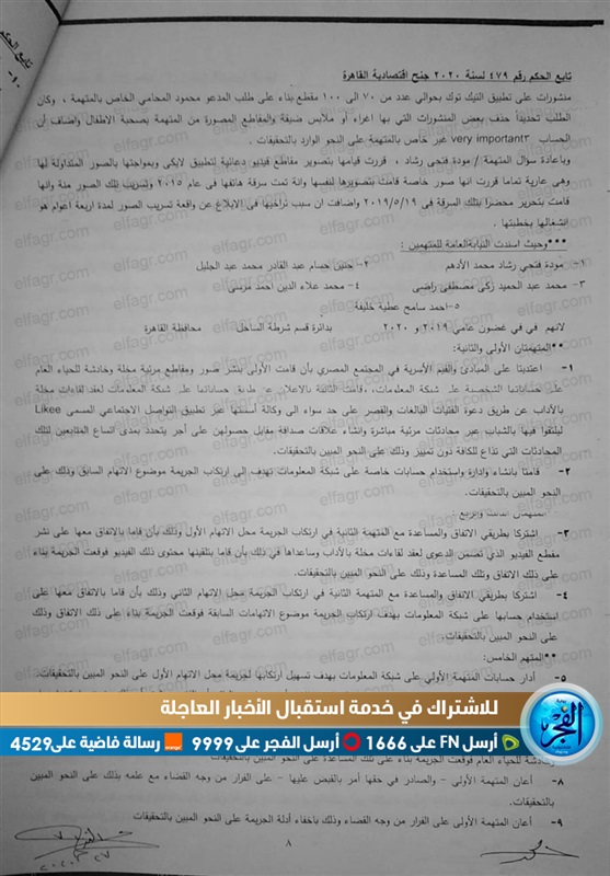 حصلت بوابة الفجر على حيثيات الحكم على فتاتي التيك توك مودة الأدهم وحنين حسام، بالسجن سنتين وغرامة 300 ألف جنيه.