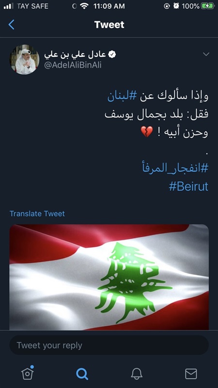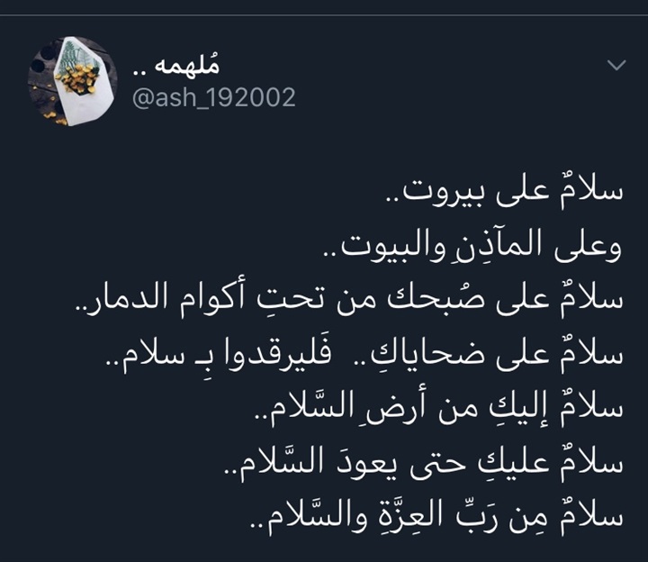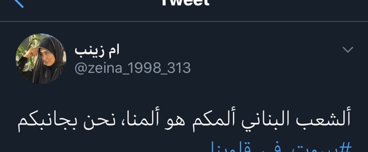 وقال آخر عبر الهشتاج "الشعب اللبناني ألمكم هو ألمنا، نحن بجانبکم" وأضاف اخر سلامٌ على بيروت.. وعلى المآذِنِ والبيوت.. سلامٌ على صُبحك من تحتِ أكوام الدمار.. سلامٌ على ضحاياكِ.. فَليرقدوا بِـ سلام.. سلامٌ إليكِ من أرضِ السَّلام.. سلامٌ عليكِ حتى يعودَ السَّلام.. سلامٌ مِن رَبِّ العِزَّةِ والسَّلام"