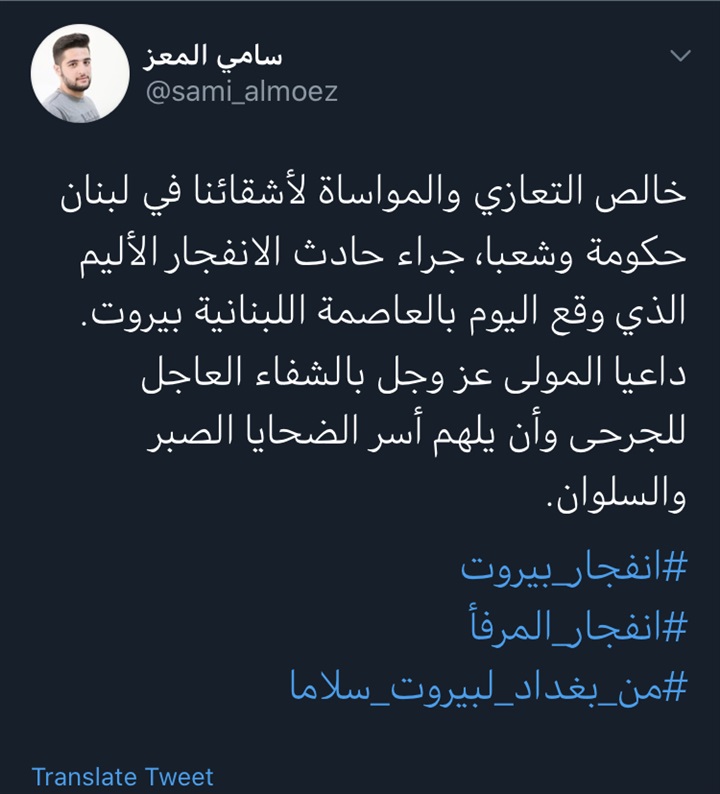وكتب احد الأشخاص عبر الهشتاج "خالص التعازي والمواساة لأشقائنا في لبنان حكومة وشعبا، جراء حادث الانفجار الأليم الذي وقع اليوم بالعاصمة اللبنانية بيروت، داعيا المولى عز وجل بالشفاء العاجل للجرحى وأن يلهم أسر الضحايا الصبر والسلوان" وعلق اخر عبر الهشتاج "الله يرحم الشهداء ويشفى الجرحى يا رب"