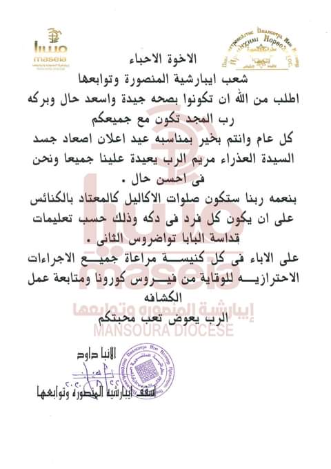 وشدد أسقف إيبارىشية المنصورة على الآباء الكهنة بإتباع وتنفيذ التعليمات مع مراعاة الجميع الإجراءات الوقائية والالتزام بالتباعد الاجتماعي بين الحاضرين وارتداء الكمامات واستخدام المطهرات.