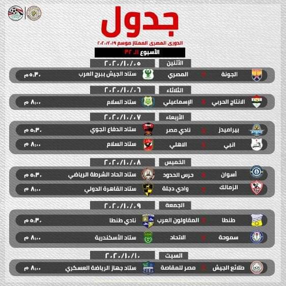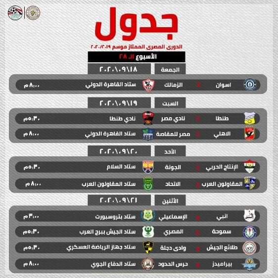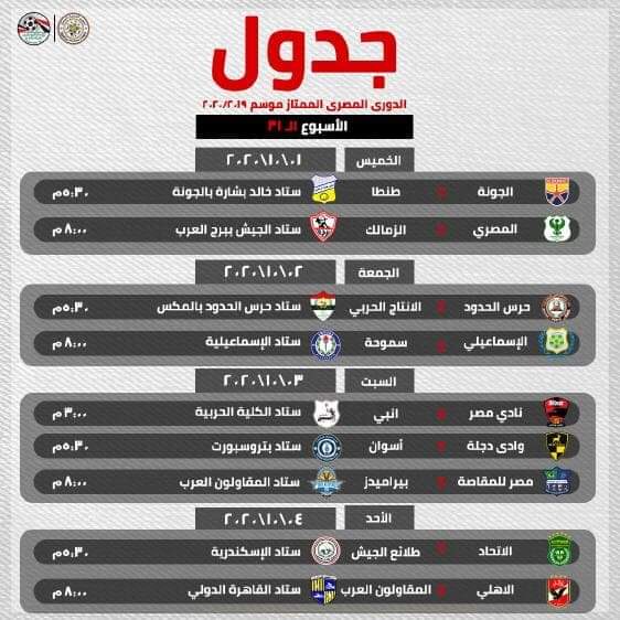أعلنت إدارة المسابقات بالاتحاد المصري لكرة القدم مواعيد الجولات المتبقية لمسابقة الدوري الممتاز فيما عدا الجولة الأخيرة ، ويتضمن جدول المواعيد جميع المباريات المؤجلة في المسابقة إضافة إلى المباراتين المتبقيتين من دور ال16 لبطولة كأس مصر ومباراتين من دور ال8 للبطولة.