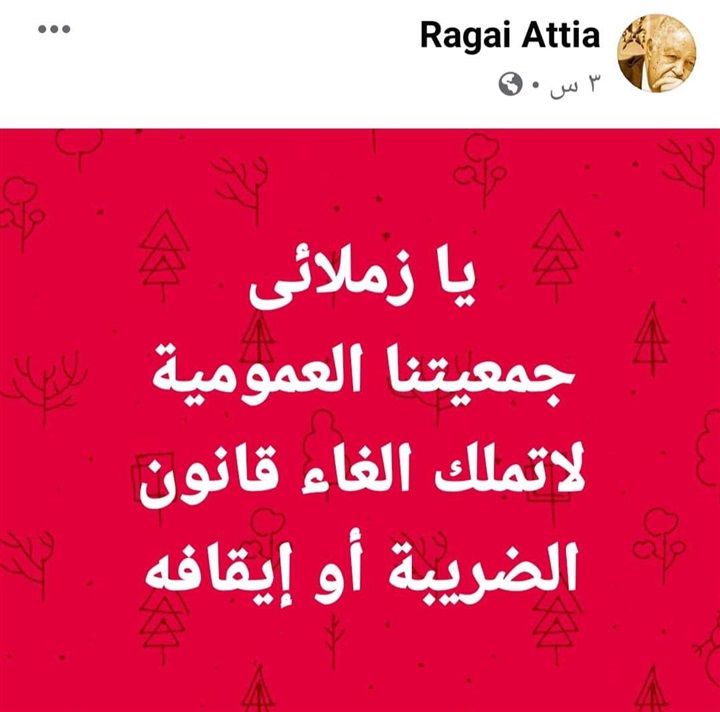 وتسائل نقيب المحامين، عبر صفحته على "فيسبوك"، قائلا: "فماذا أنتم فاعلون فيها!"، مضيفا: "يا زملائي جمعيتنا العمومية لا تملك إلغاء قانون الضريبة أو إيقافه".