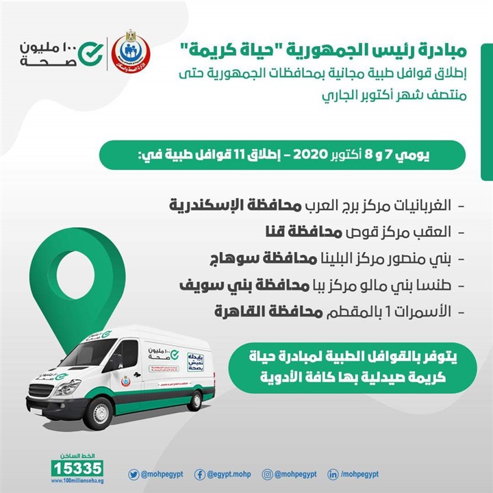 أعلنت وزارة الصحة والسكان، عن إطلاق قافلة طبية ضمن مبادرة رئيس الجمهورية "حياة كريمة" للكشف والعلاج مجانًا بمحافظات(الإسكندرية - قنا - سوهاج - بني سويف - القاهرة - الوادي الجديد - مطروح - أسوان - البحيرة - المنوفية - دمياط)، وذلك يومي 7 و8 أكتوبر.