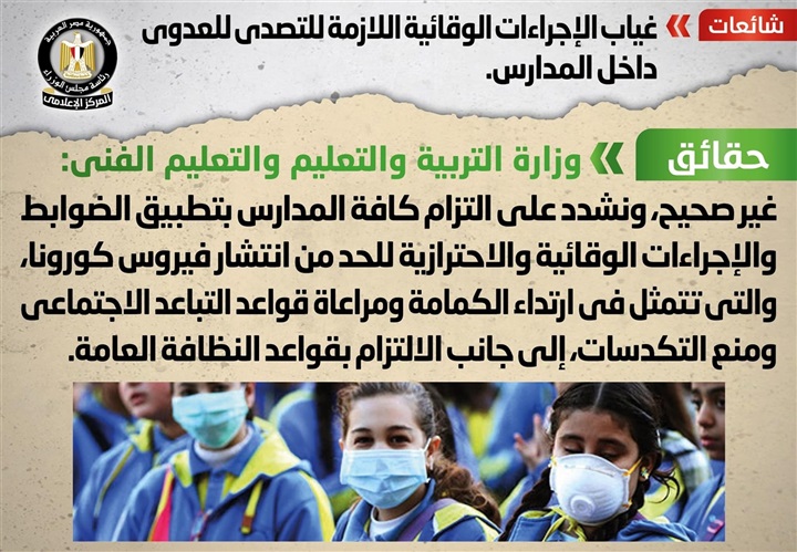 وتواصل المركز الإعلامي مع وزارة التربية والتعليم والتعليم الفني، التي نفت تلك الأنباء، مشددة على التزام كافة المدارس بتطبيق الضوابط والإجراءات الوقائية والاحترازية للحد من انتشار فيروس كورونا، والتي تتمثل في ارتداء الكمامة ومراعاة قواعد التباعد الاجتماعي ومنع التكدسات، إلى جانب الالتزام بقواعد النظافة العامة، وذلك في إطار حرص الدولة على صحة وسلامة الطلاب.