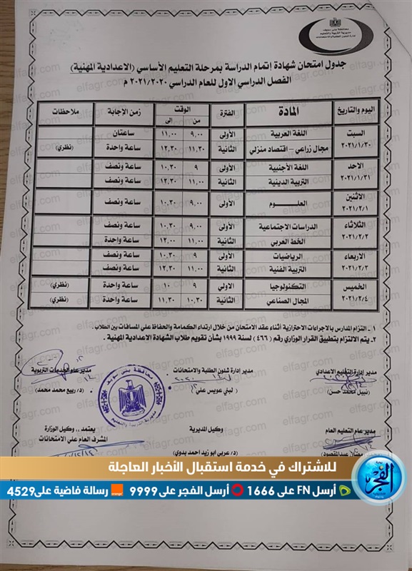 وتنشر "الفجر" جداول الإمتحانات الواردة من مديرية التربية والتعليم، بعد إعتمادها من محافظ بني سويف.