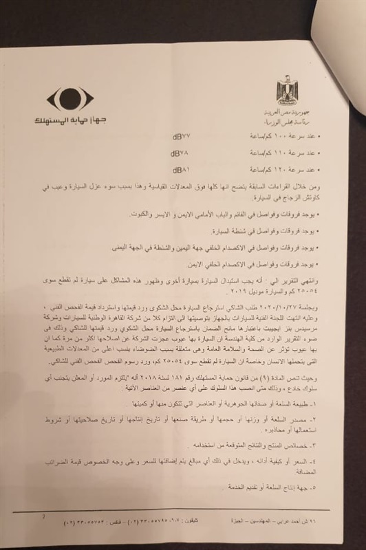 واثبت تقرير كلية هندسة المطرية بجامعة حلوان أن السيارة يوجد بها عيب فى الفواصل والفروقات فى الشنطة والأبواب وكبوت السيارة، ومركز الخدمة عجز عن إصلاح هذه العيوب والشاكي يخشى عمل هذه الإصلاحات خارج التوكيل وإلا يسقط حقه فى الضمان، كما أن هذه الإصلاح قد تؤدي إلى انخفاض القيمة السوقية للسيارة التى لم تقطع سوي 25054 كم، ويوجد عيب صناعة أيضًا فى عزل السيارة ودخول هواء داخل الكابينة من الخارج، وتسجيل قيم الضوضاء داخل الكابينة وعلى اختبار الطريق على سرعات السيارة المختلفة من 40 وحتى 120 كم/ساعة، تتراوح ما بين 75 دى بى وحتى 81 دى بى وجميعها أكبر من القيم القياسية وهذا بسبب سوء عزل السيارة، والقيم القياسية للضوضاء داخل كابينة السيارة لا تتعدى 70 دى بى وأكثر من هذا يعد فى خطورة بالغة، وهذا يستدعي تغيير كل عزل السيارة ، كما أن يوجد مشكلة فى مفصلة الكرسي، ويوجد مشكلة فى مفصلة الكبوت، ويوجد صوت دبدبة من العفشة الأمامية، كما يوجد مشكلة فى قاعدة الإكصدام الخلفى الأيمن، كما يوجد ترشيح (بخار) زيت من غطاء الزيت ، وظهور مثل هذة المشاكل على السيارة ولم تقطع سوي 25054 كم، مع أن العمر الإفتراضي لهذة الأجزاء يتجاوز 90 إلى 200 كم للمحرك.