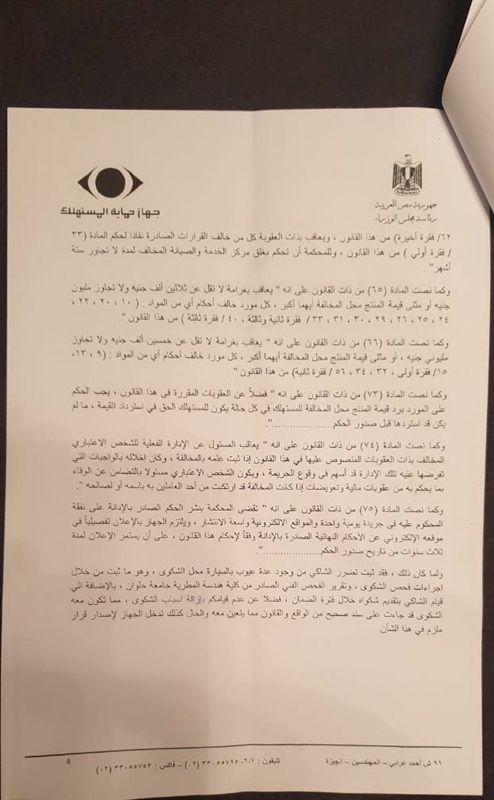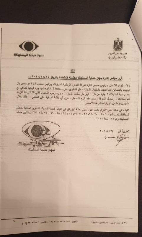 وصدر قرار من مجلس إدارة جهاز حماية المستهلك بإلزام رئيس مجلس إدارة شركة القاهرة الوطنية للسيارات ورئيس مجلس إدارة مرسيدس بنز إيجيبت بالتضامن فيما بينهما بإستبدال السيارة محل الشكوي بأخري جديدة أو إسترجاعها ورد قيمتها للشاكي مع خصم نسبة إستهلاك 2 جنيه عن كل 1 كيلو متر قطعته السيارة، مع رد رسوم الفحص الفنى للشاكي إذا كان قد قام بسدادها، وتحمل الشركة رسوم عقد البيع المسجل، دون أى تكلفة إضافية على الشاكى ، وذلك خلال عشرون يومًا من تاريخ إستلام هذا الإخطار، وفى حالة عدم الإلتزام سيتك إحالة الأوراق للنيابة العامة لتحريك الدعوي الجنائية .