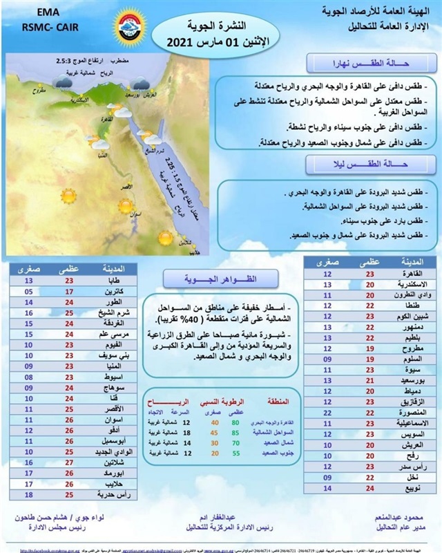 وبالنسبة لحالة البحر المتوسط فتكون مضطربة وارتفاع الموج فيه من مترين ونصف الي ٣ أمتار والرياح السطحية شمالية غربية أما بالنسبة لحالة البحر الأحمر فتكون معتدلة وارتفاع الموج فيه من متر ونصف الي مترين وربع والرياح السطحية شمالية غربية.