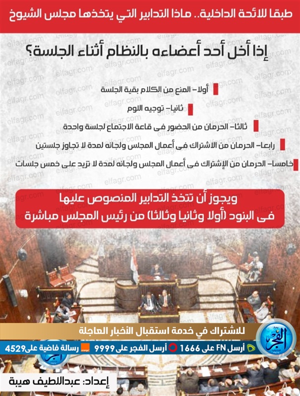 وترصد "الفجر" من خلال "إنفوجراف" التدابير التي يتخذها المجلس إذا أخل أحد أعضاءه بالنظام أثناء الجلسة لـ "مجلس الشيوخ" طبقًا للائحة الداخلية: