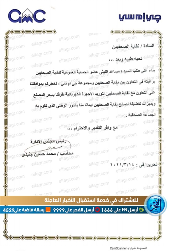 أعلن مساعد الليثي المرشح لعضوية مجلس نقابة الصحفيين، عن حصوله على عرض مميز لصالح الزملاء الصحفيين وأسرهم، من مصانع شركة GMC وإليكتروستار، بعد جلسة ودية مع رجل الأعمال محمد جنيدي رئيس مجلس إدارة مجموعة جي إم سي.
