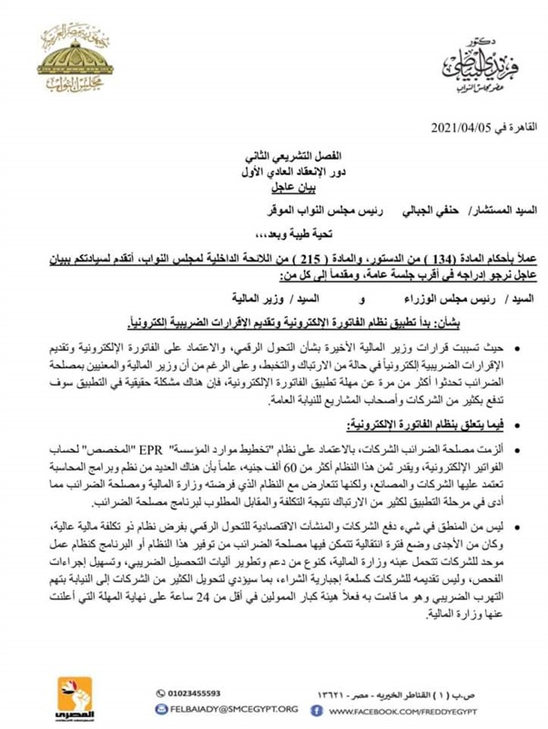 تقدم الدكتور النائب فريدي البياضي، عضو اللجنة العامة بمجلس النواب، عضو الحزب المصري الديمقراطي الاجتماعي، بأول بيان عاجل، إلى المستشار حنفي جبالي رئيس البرلمان، موجه إلى الدكتور مصطفى مدبولي رئيس الوزراء، والدكتور محمد معيط، وزير المالية، بشأن مد مهلة الإقرارات الضريبية بسبب مشاكل المنظومة الجديدة، وبدأ تطبيق نظام الفاتورة الإلكترونية وتقديم الإقرارات الضريبية إلكترونيًا.