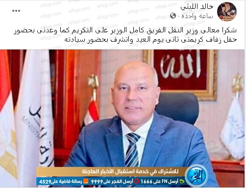واحتفل قائد قطار أسوان والمدعو خالد الليثي بتكريم الوزير له، اليوم الأربعاء، على صفحته الشخصية على الفيسبوك، قائلا: "شكرا معالي وزير النقل الفريق كامل الوزير على التكريم كما وعدني بحضور حفل زفاف كريمتي ثاني يوم العيد واتشرف بحضور سيادته".