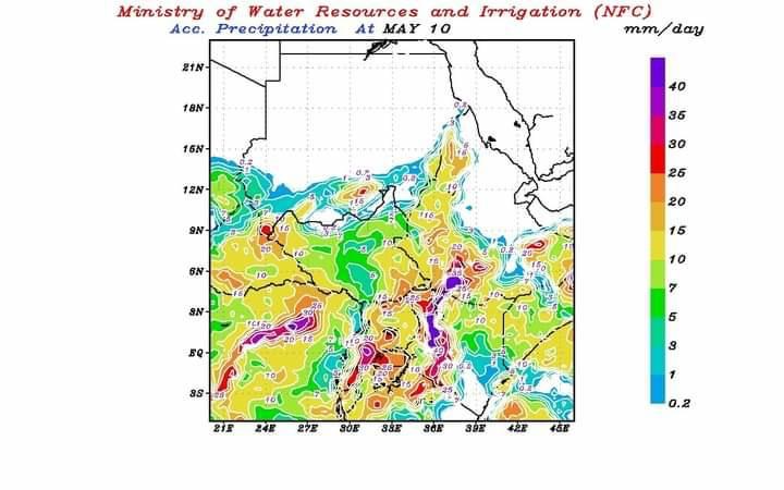 أشارت نتائج تشغيل النموذج الرياضي بالتنبؤ بالطقس والأمطار، اليوم السبت، إلى سقوط أمطار متوسطة إلى غزيرة، تتراوح بين "7 - 30 مم" على الهضبة الإثيوبية، وسقوط أمطار متوسطة إلى غزيرة تتراوح بين "7 - 25 مم"، على منطقة المستنقعات، وسقوط أمطار متوسطة الى غزيرة تتراوح بين "7 - 20 مم"، على منطقة البحيرات الاستوائية.