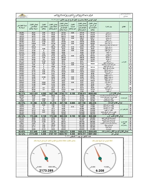 أعلنت وزارة الموارد المائية والري، الانتهاء من تأهيل ترع بأطوال تصل إلى 2173.289 كيلومترًا حتى الآن، بنسبة تنفيذ بلغت 36.12% بمختلف محافظات الجمهورية، مؤكدة أنه جارٍ العمل على أطوال تصل إلى6016.511 كيلومترًا بمختلف محافظات الجمهورية.