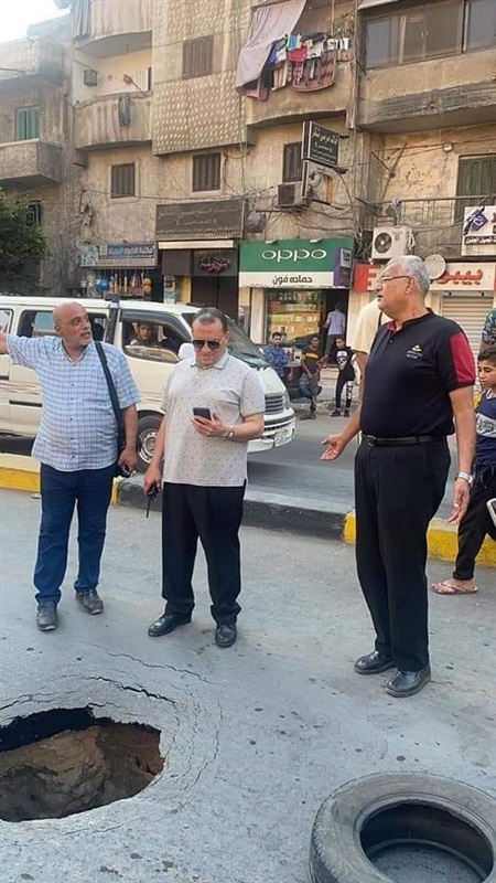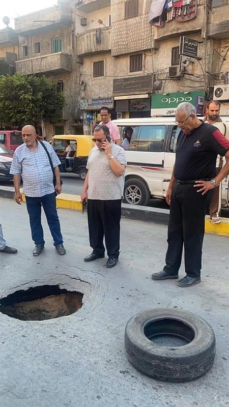وتبين من الفحص أن الهبوط ناتج عن كسر مفاجئ في ماسورة خط انحدار الصرف الصحي 800 ملي بشارع بورسعيد الرئيسي.