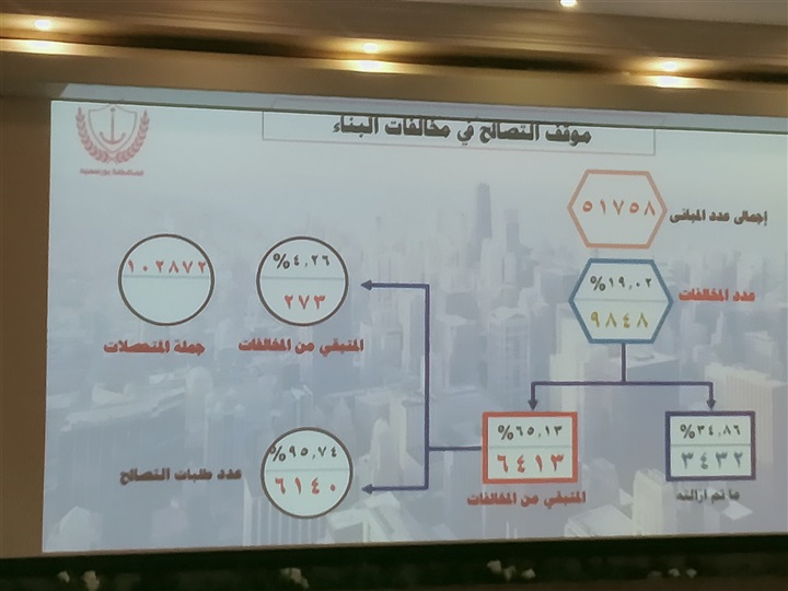 عرضت المهندسة نرمين نشأت المديرة العامة للتخطيط العمراني في محافظة بورسعيد، على اللواء محمود شعراوي وزير التنمية المحلية عرضا تفصيليا لإجمالي عدد مباني المحافظة وهي 51758 مبنى، موضحة رصد كل مخالفات البناء، مؤكدة أن عدد المباني التي تم التصالح معها بالفعل 300 مبنى من إجمالى 6140 طلب تصالح مقدم للمحافظة.