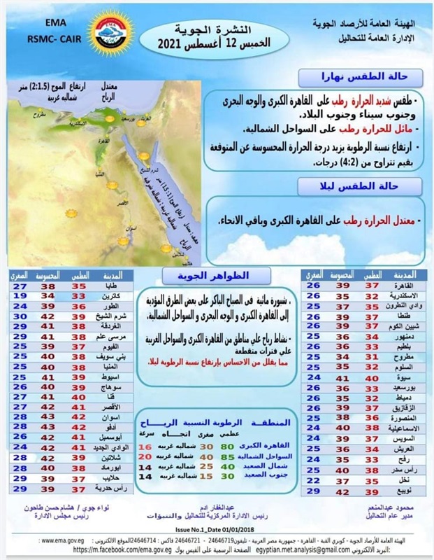 أعلنت الهيئة العامة للأرصاد الجوية المصرية، خلال بيانها اليومي، حالة الطقس المتوقعة الخميس الموافق 12 أغسطس 2021، على مدن ومحافظات الجمهورية، وجاءت كالتالي: