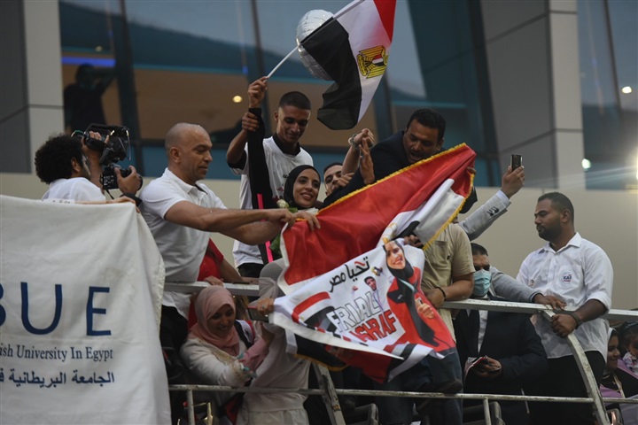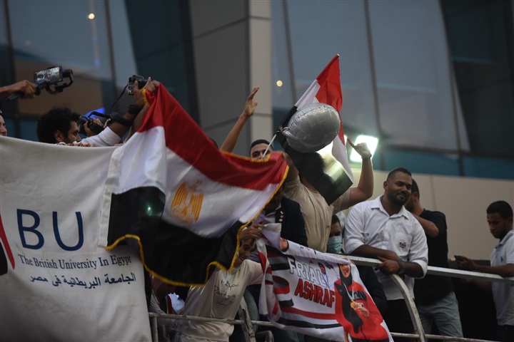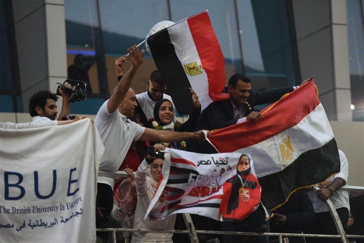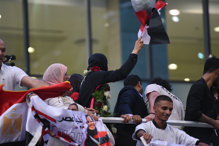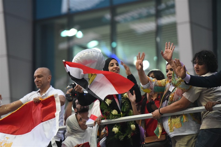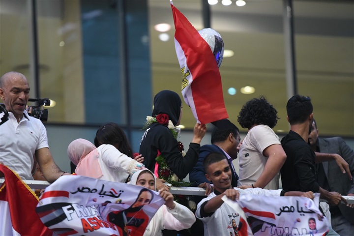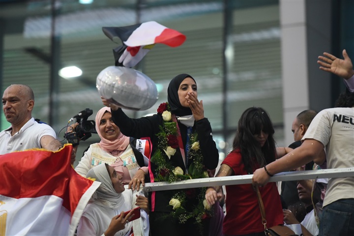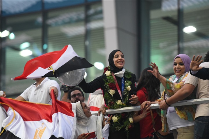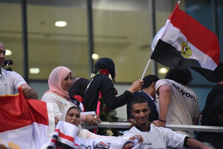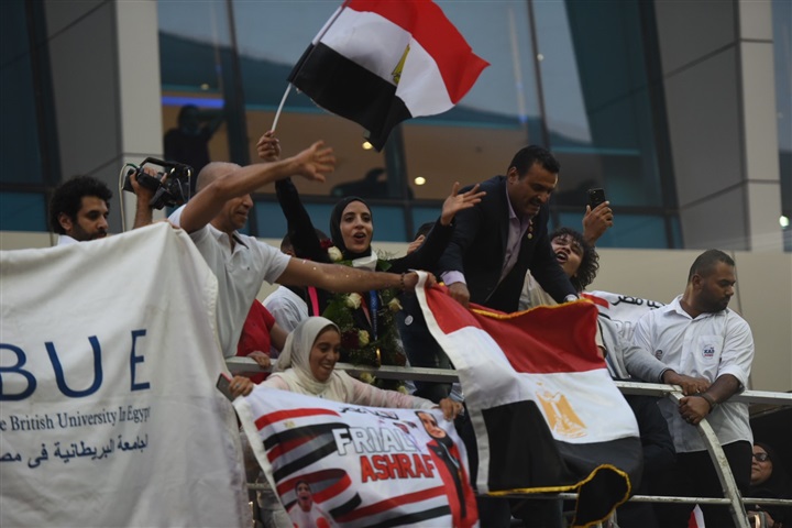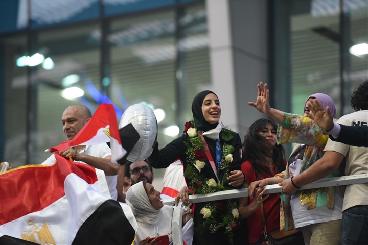 لحظة استقبال أبطال مصر «فريال أشرف والجندي» في مطار القاهرة بكاميرا الفجر الرياضي